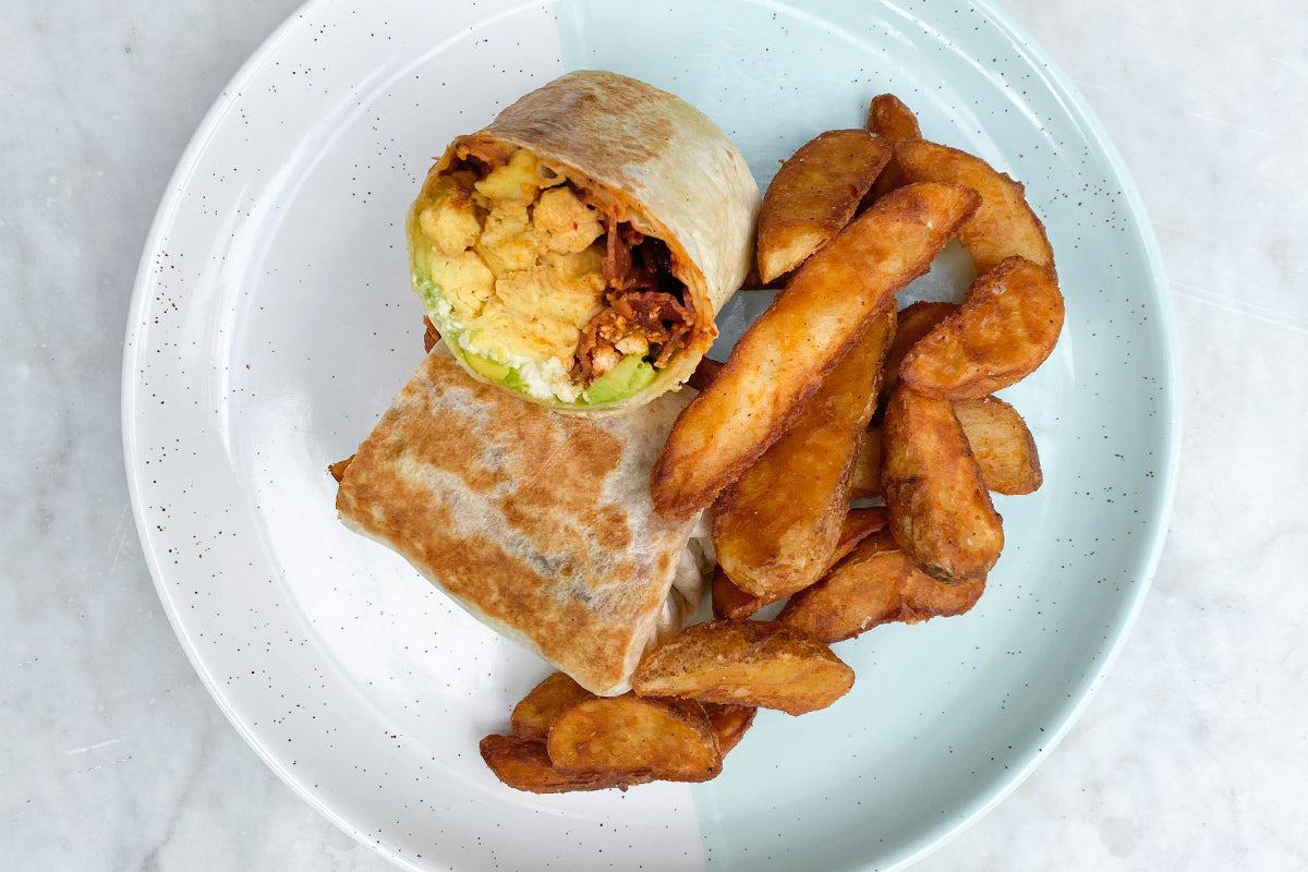 Scrambled eggs, bacon, avocado, sheep's milk feta, crispy potato & guajillo sauce served with a side of crispy potato wedges. Allergens: D = Contains dairy, E = Contains egg, S = Contains soy, G = Contains gluten