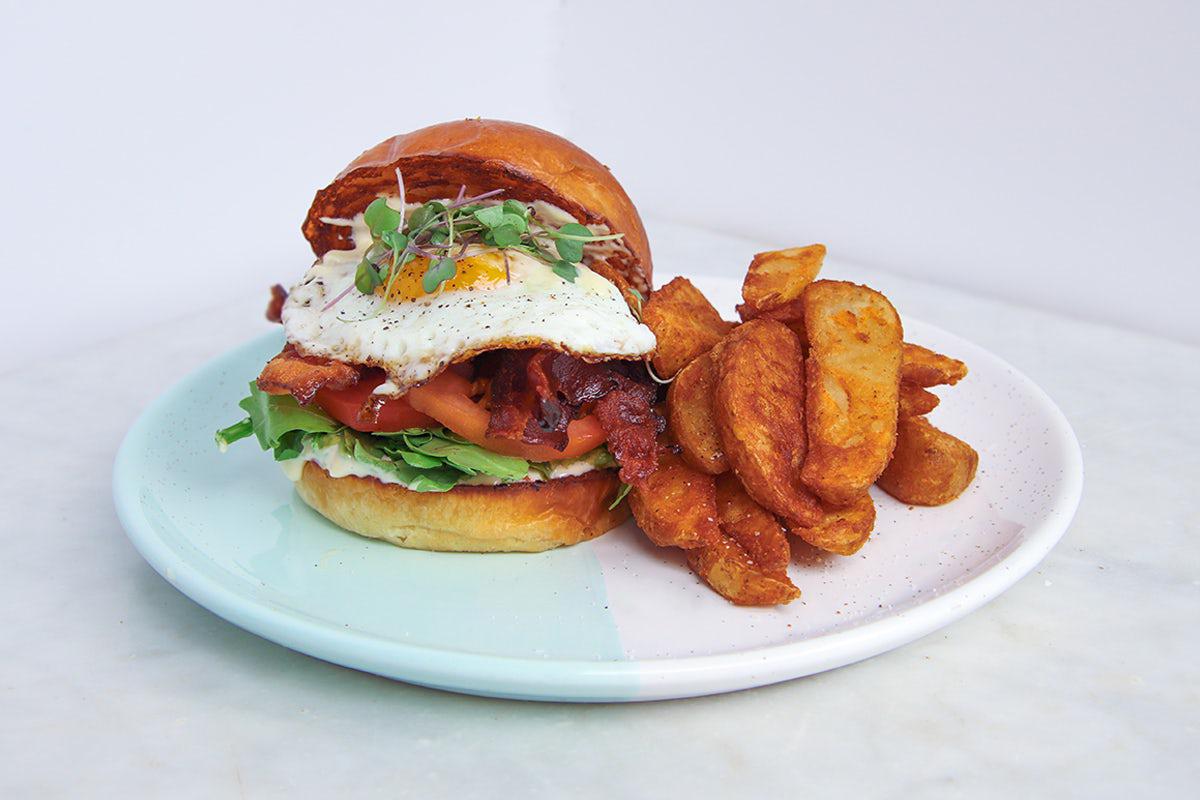 Crispy bacon, avocado, arugula, tomato, a fried egg & garlic aioli on a brioche roll served with crispy potato wedges. Allergens: E = Contains egg, S = Contains soy, G = Contains gluten