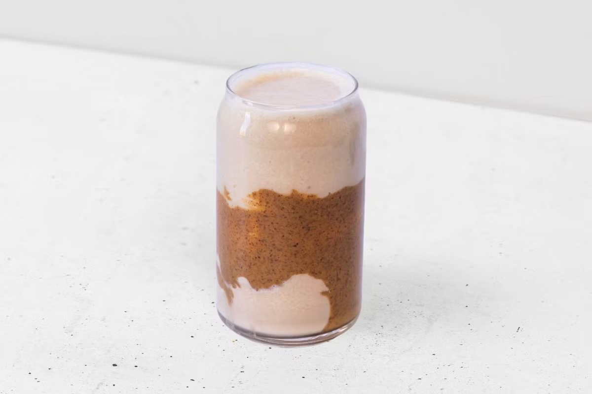 Almond milk with banana, dates, almond butter, cinnamon & vanilla plant based protein powder