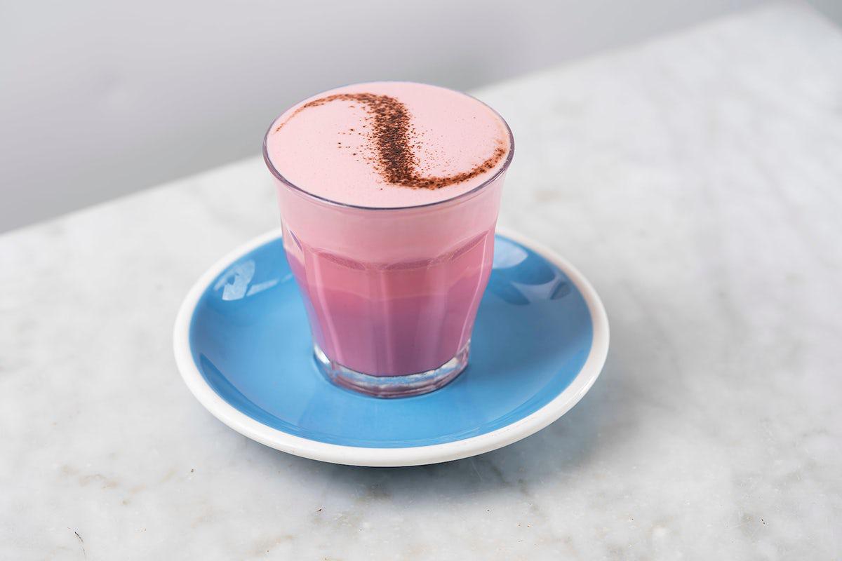 Dehydrated beet powder that is rich in antioxidants, and good for digestion. This drink is married with a dusting of cocoa and steamed almond milk.