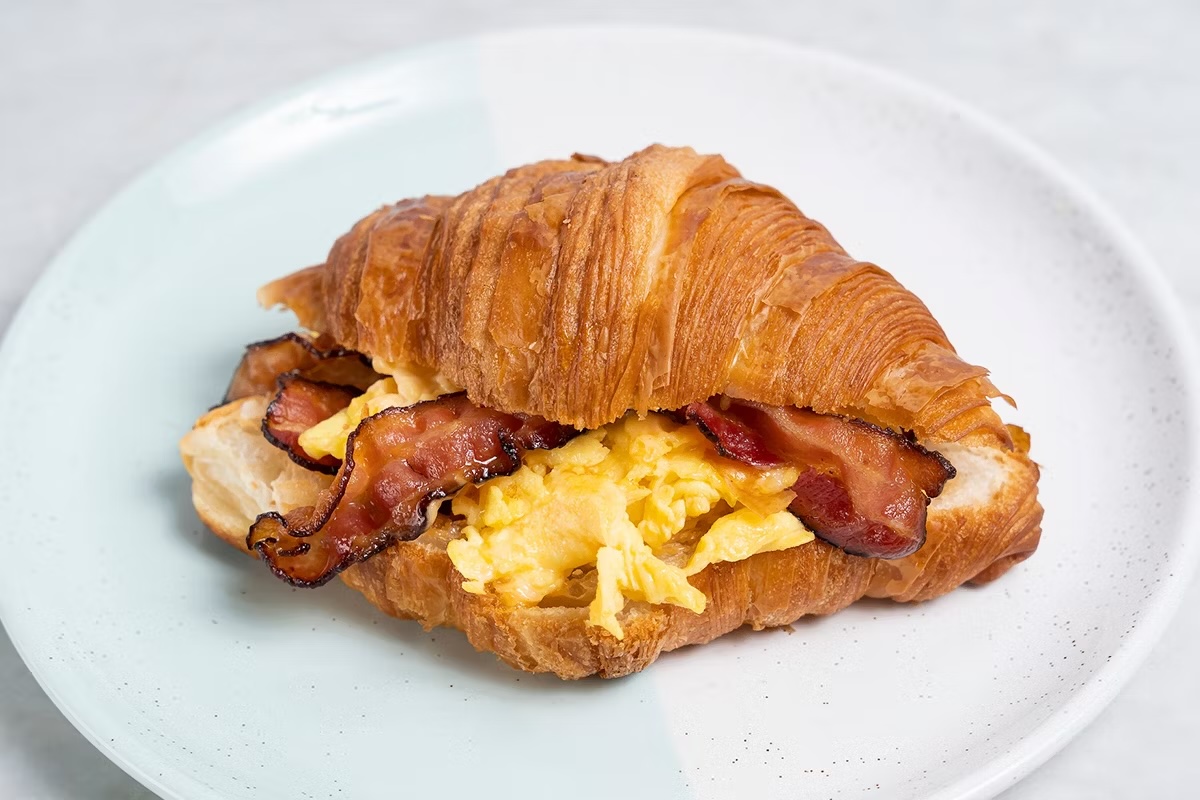 Fresh baked butter croissant with scrambled egg, bacon, cheddar and chipotle mayo. Allergens: G = Contains gluten, D= Contains dairy, E= Contains egg