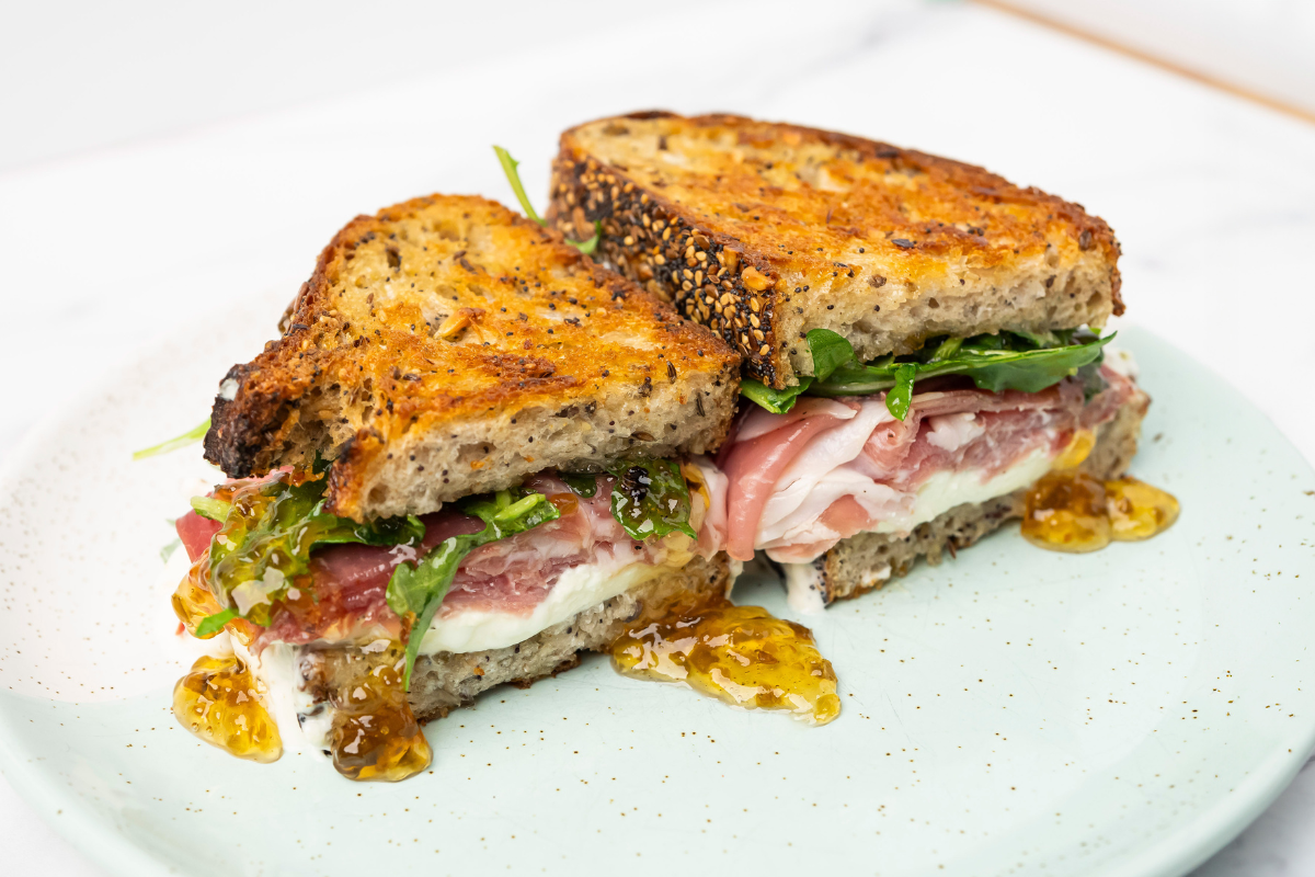 Crafted with care and bursting with vibrant flavors, this sandwich is a celebration of fresh, seasonal ingredients. burrata, prosciutto, spicy jam, arugula greens with a lemon zesty vinaigrette on sourdough Allergens: G = Contains gluten, D= Contains dairy