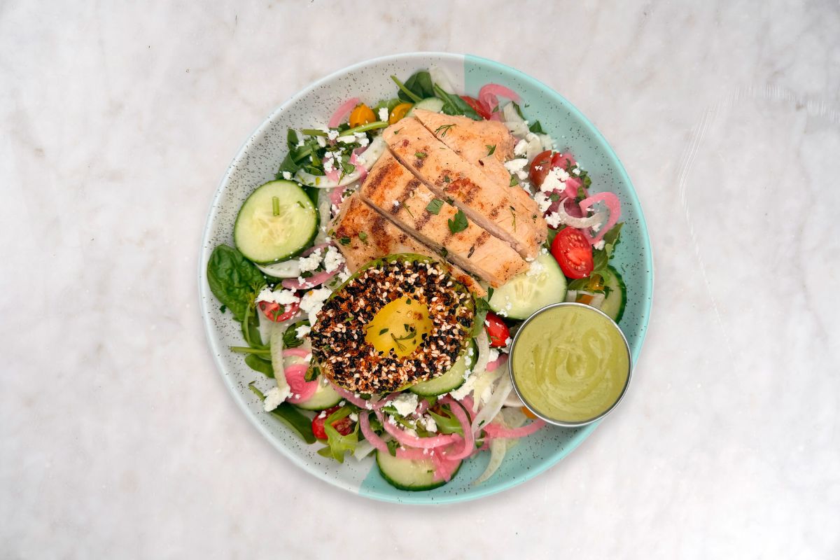 A refreshing mix of summer greens with crisp cucumber, fennel, cherry tomatoes, pickled onion and feta tossed in a tangy vinaigrette and topped with Spiced Chicken & an avocado half coated in sesame seeds. D = Contains dairy S = Contains sesame