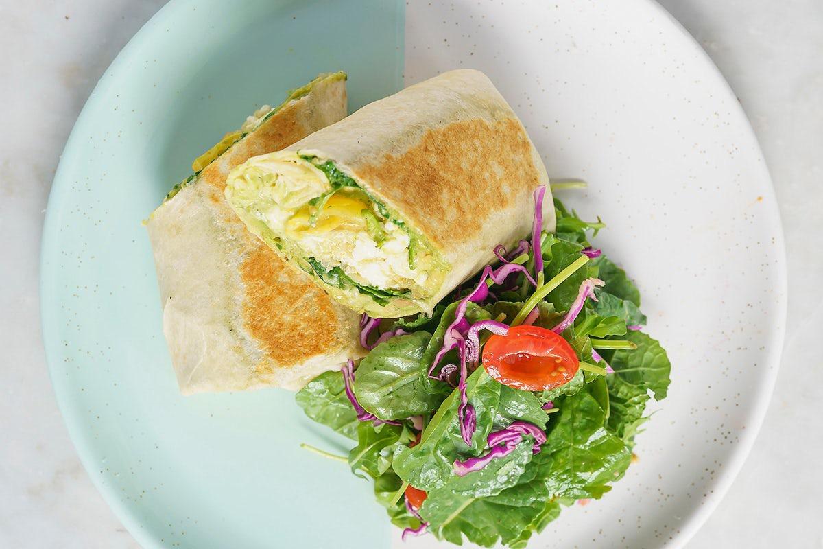 Egg whites, sautéed spinach, roasted tomatoes, avocado, lentils, sheep's milk feta & chimichurri mayo served with a dressed salad. Allergens: D = Contains dairy, E = Contains egg whites, S = contains soy, G = Contains gluten