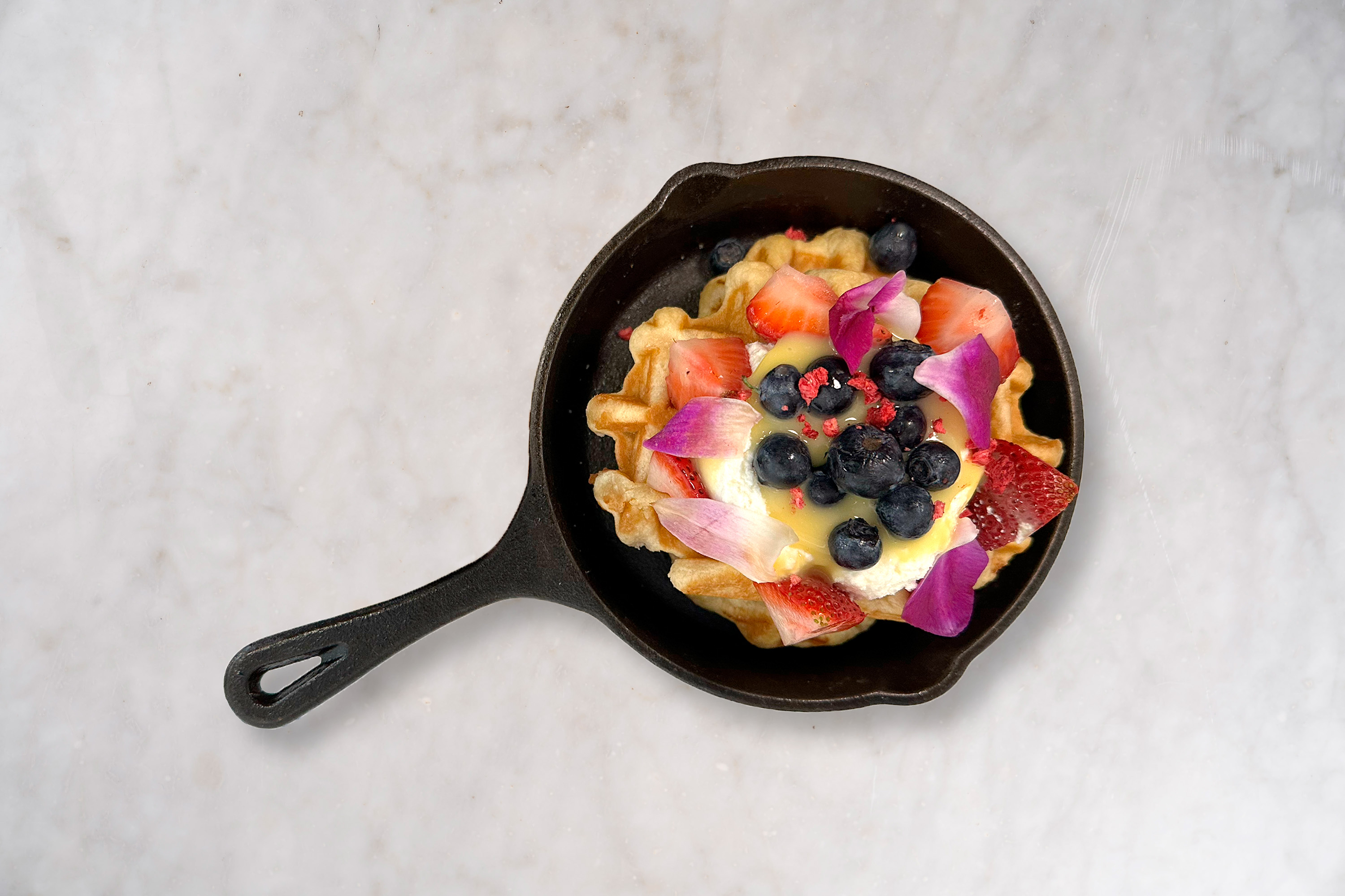 Lemon ricotta waffles with whipped ricotta, fresh berries, citrus curd, edible petals, freeze dried raspberries & maple syrup. G= Contains gluten D = Contains dairy, E = Contains egg, S = Contains soy *Available at selected Cafés