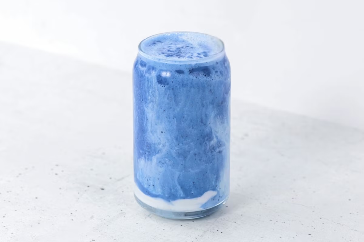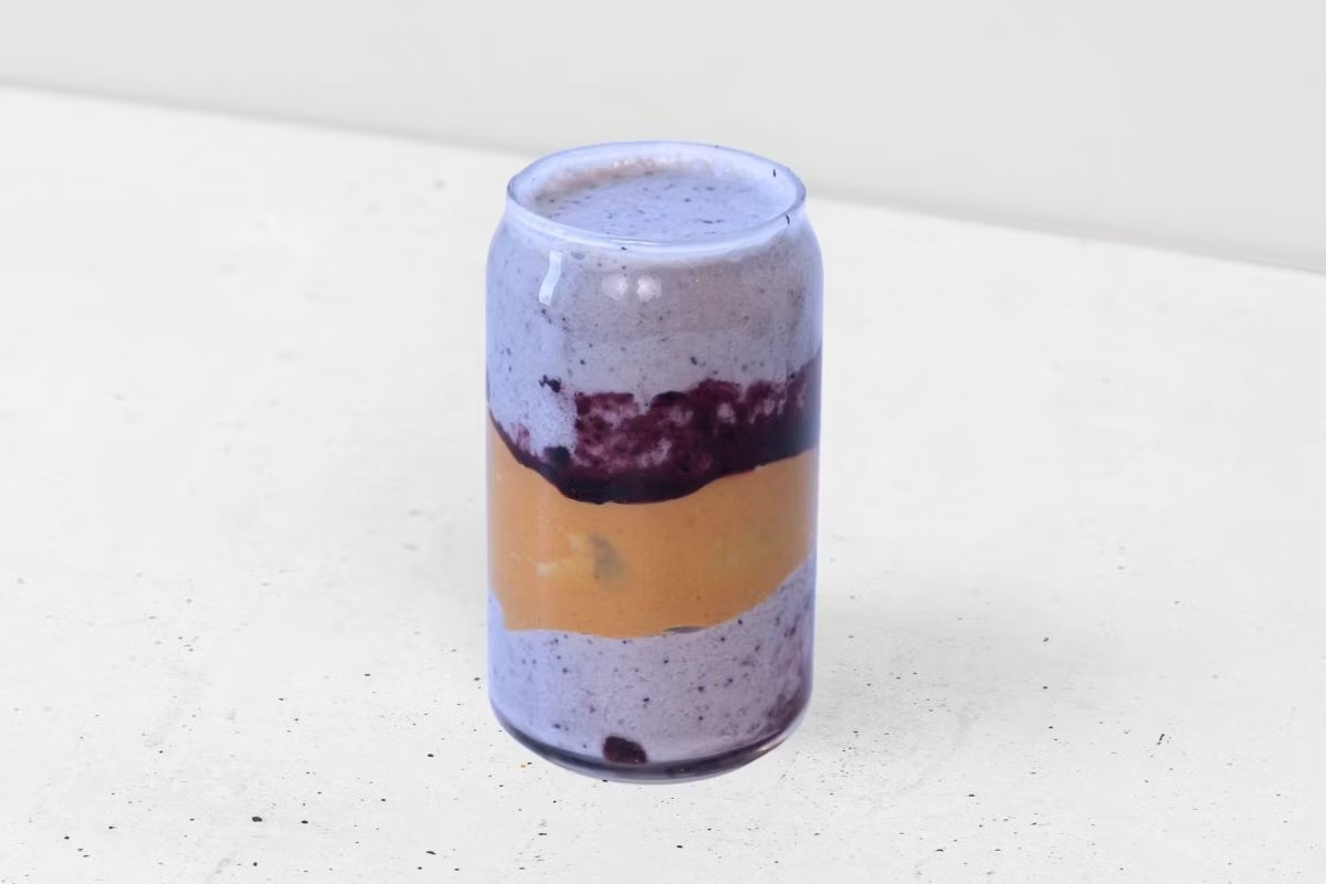 A tropical smoothie inspired by the Aussie coast. This smoothie is a blend of banana, mango puree, almond milk, blueberries, vegan cream, protein powder and blue spirulina.