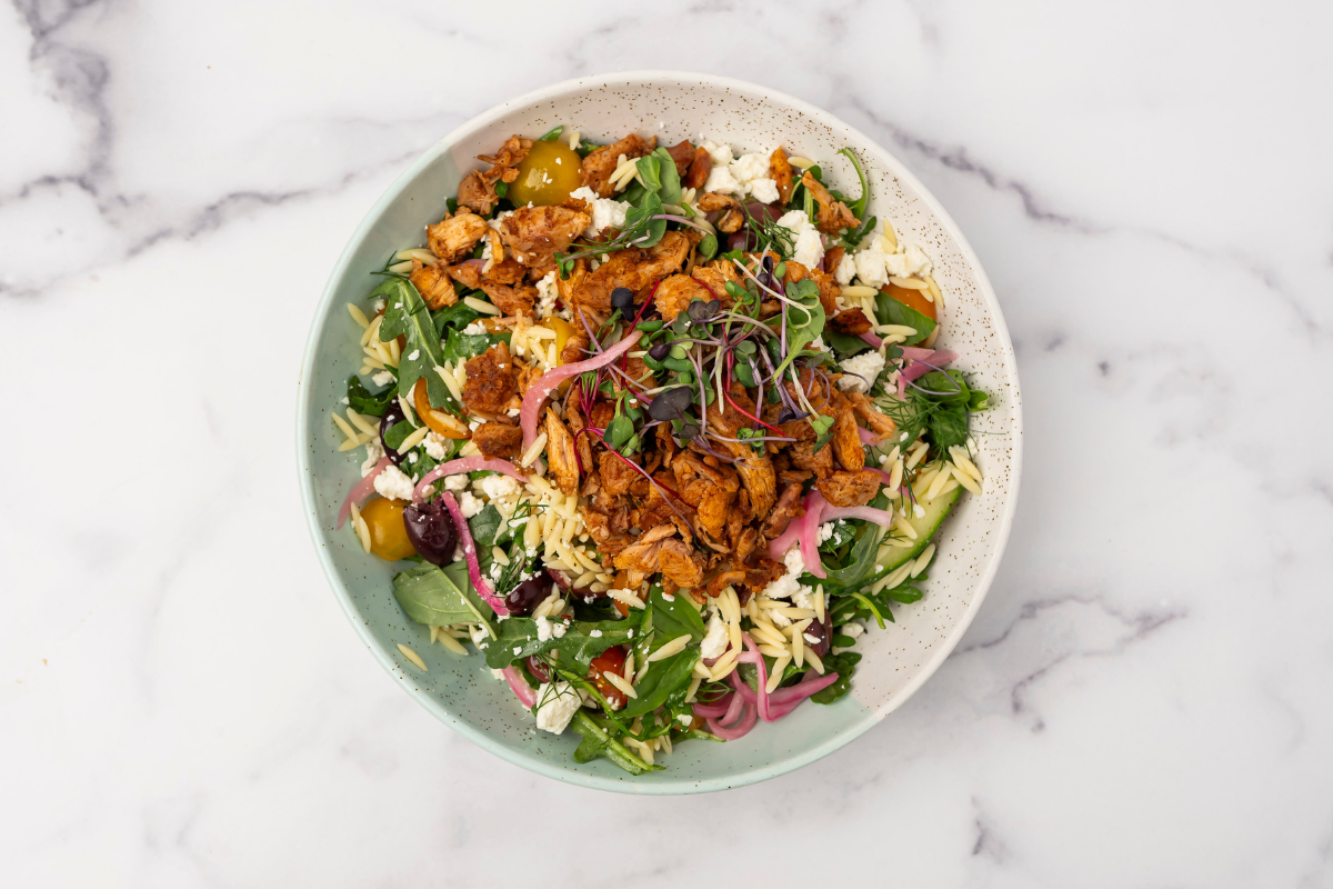 Whether enjoyed as a light lunch or a satisfying dinner, this salad is sure to tantalize your senses and leave you craving more. Arugula, lemon garlic chicken, dill, basil, cucumber, cherry tomatoes, kalamata olives, feta, orzo & pickled onions w/ a lemon vinaigrette. Allergens: G = Contains gluten, D= Contains dairy, S= Contains Soy
