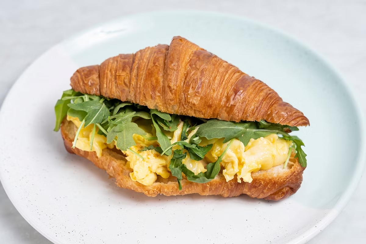 Fresh baked butter croissant with scrambled eggs, cheddar, arugula with house made aioli D = Contains dairy, E = Contains egg, S = Contains soy