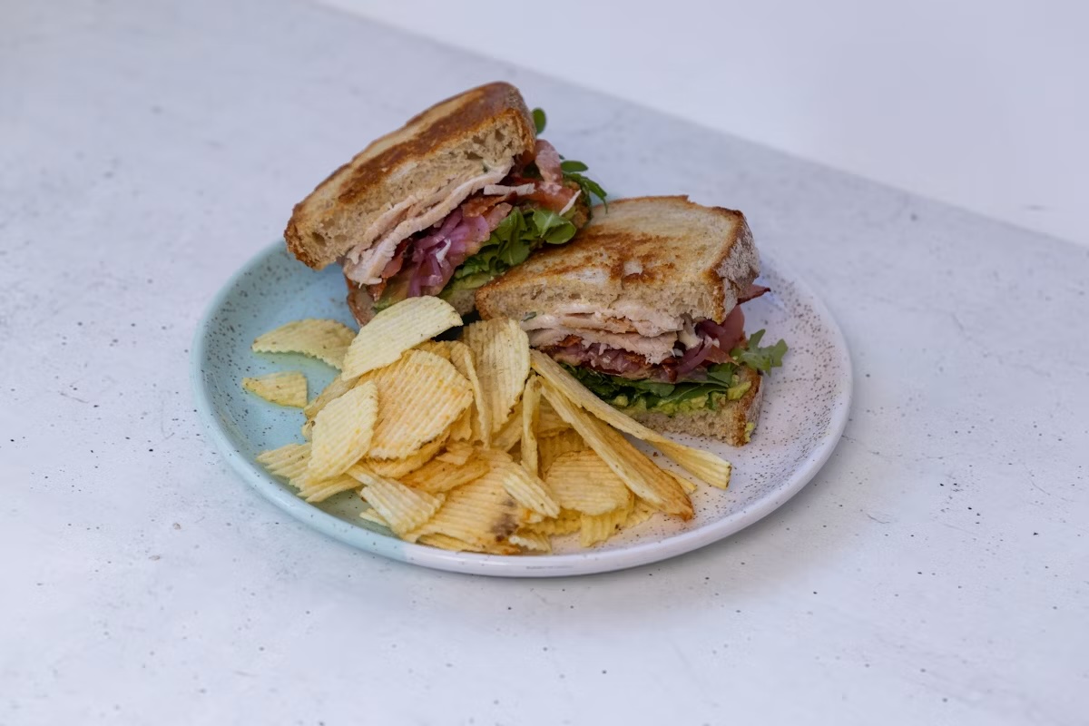 Garlic aioli, turkey, bacon, avocado smash, tomatoes, arugula & pickled onions on sourdough Allergens: G = Contains gluten, S= Contains soy, E= Contains egg