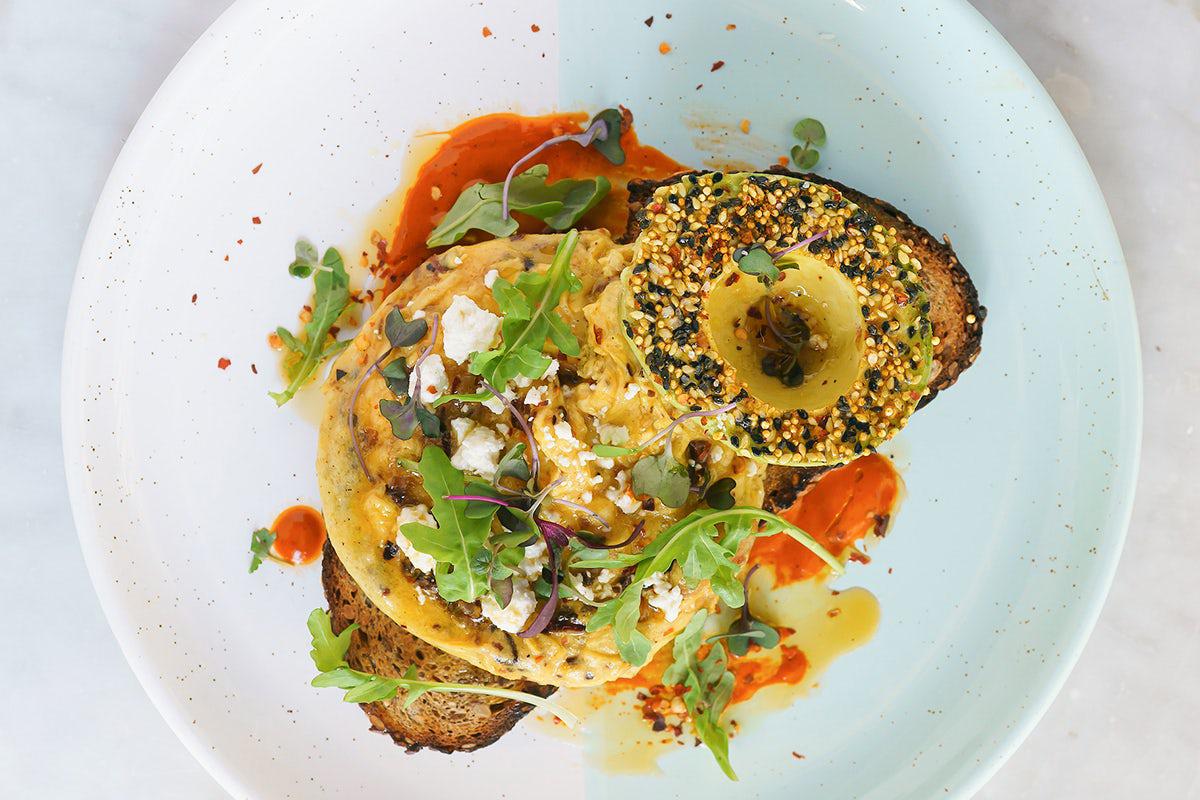 Chili shallot-folded eggs with sheep's milk feta, avocado & sesame seeds topped with chili oil. Allergens: D = Contains dairy, E = Contains egg, S = contains soy, SE = Contains sesame seeds, G = Contains gluten