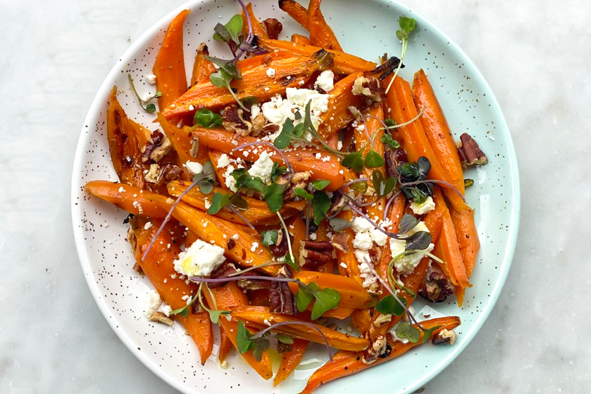 Honey roasted heirloom carrots topped with feta cheese, toasted pecans, olive oil, maldon salt, black pepper & micro herbs. Allergens: N = Contains tree nuts, D = Contains dairy