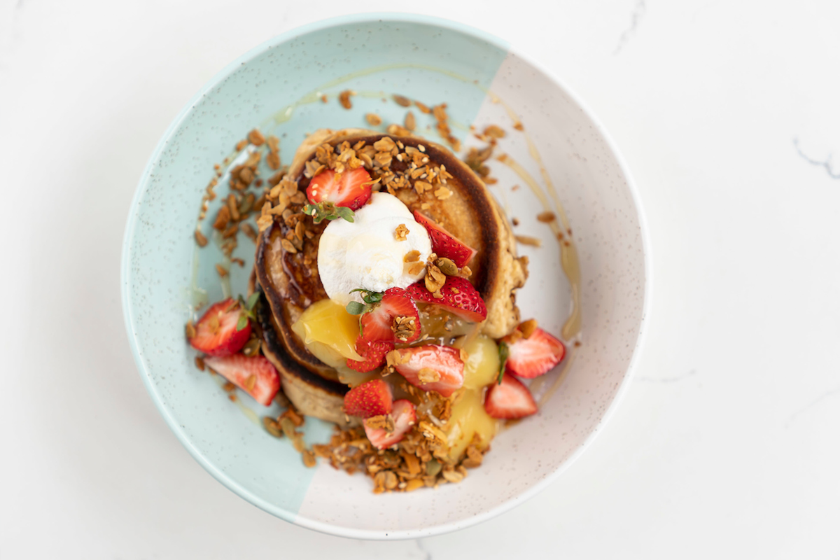 "Lemon ricotta pancakes with whipped ricotta, fresh berries, citrus curd, edible petals, freeze dried raspberries & maple syrup. G= Contains gluten D = Contains dairy, E = Contains egg, S = Contains soy"