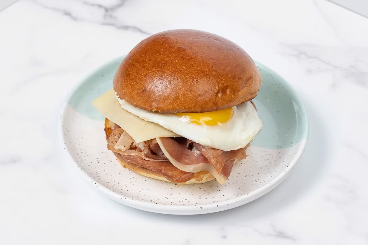 Fried egg, bacon, cheddar cheese, aioli and barbeque sauce served on a brioche bun. Allergens: G= Contains gluten, D= Contains dairy, E= Contains egg, S= Contains soy