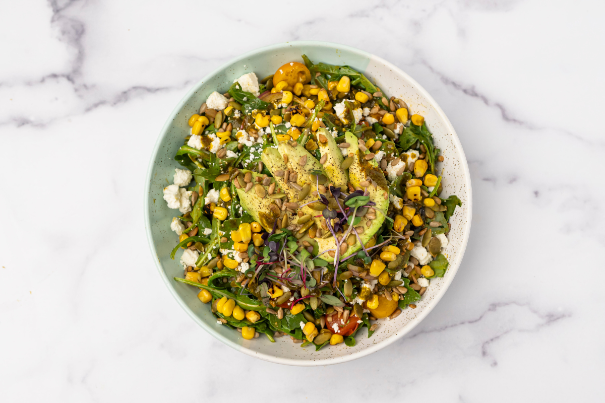 A celebration of fresh, seasonal ingredients that will transport you to sunny skies and warm evenings with every bite. Grilled corn, feta, avocado, charred cherry tomatoes, pickled onions, arugula, pepitas w/ a cilantro lime vinaigrette. Allergens: D= Contains dairy