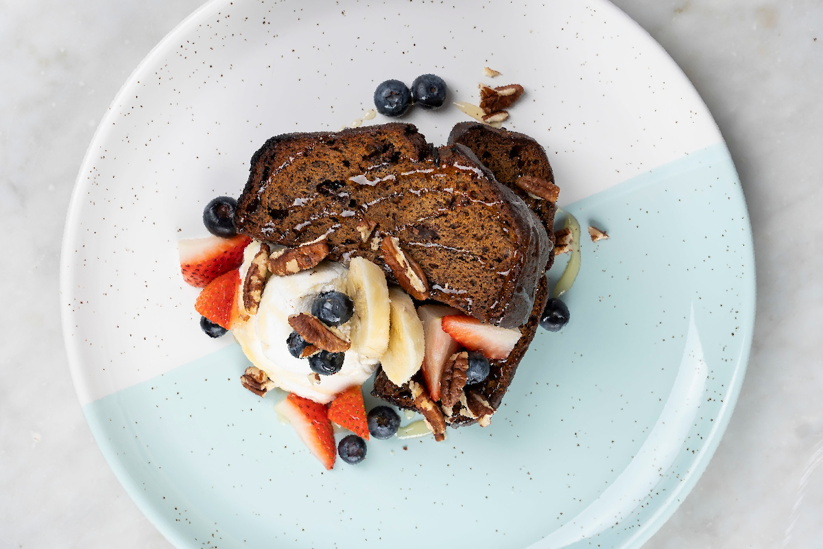 "GF banana bread served with whipped cow's milk ricotta, fresh berries & roasted pecans drizzled in locallly sourced honey. GF = Gluten-free, N = Contains tree nuts, D = Contains dairy"