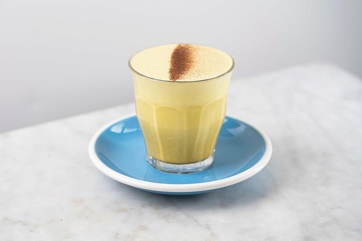 Turmeric powder, cinnamon, ginger and black pepper, good for detoxifying the body and reducing inflammation made with steamed almond milk.