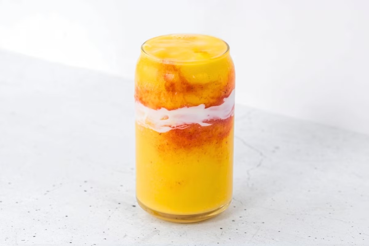 Banana, pineapple, mango, orange juice, coconut cream & strawberry sauce