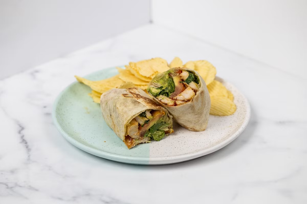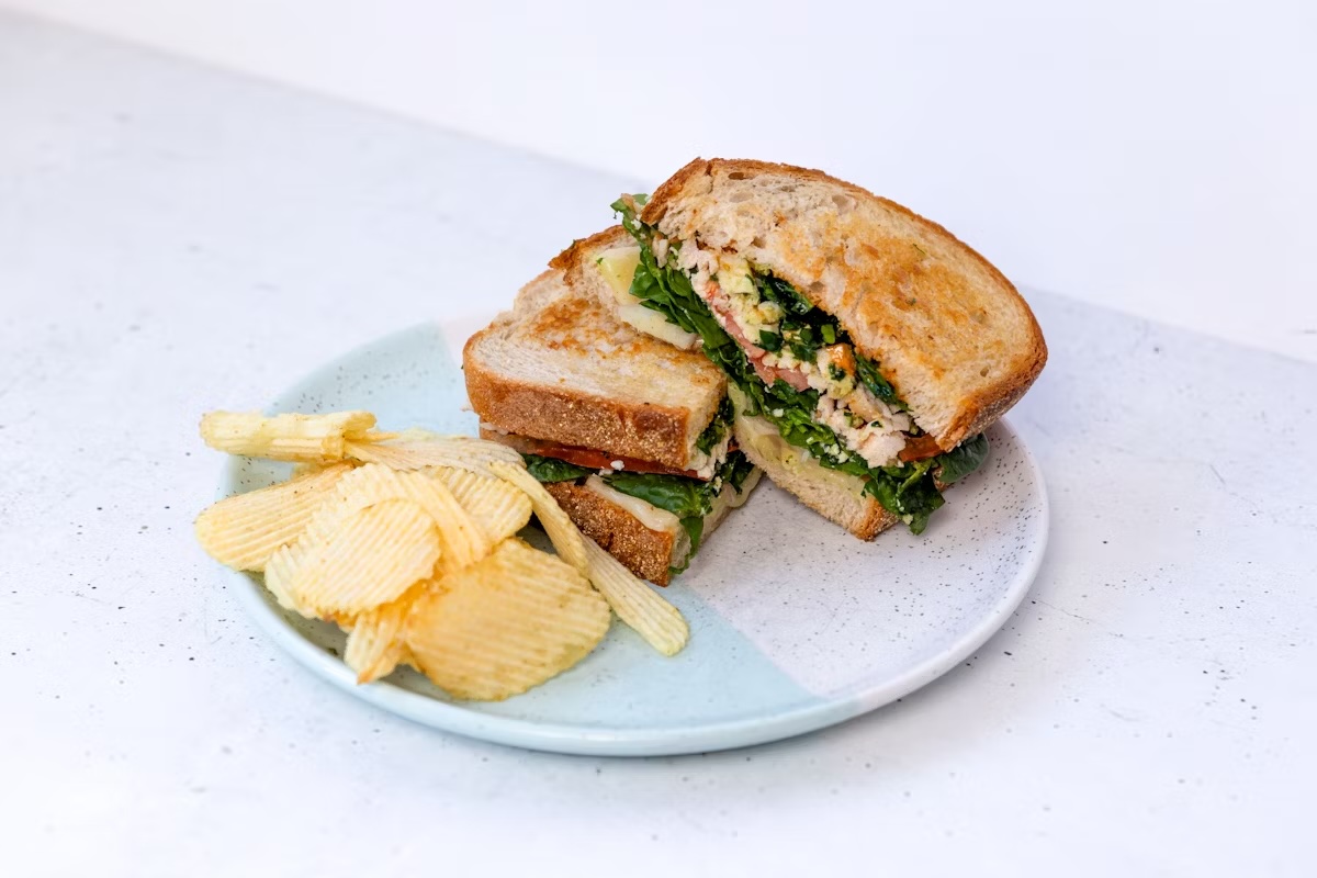 Chicken salad, dill, cheddar cheese, spinach, dill & avocado between toasted sourdough bread; served with a side of crisps