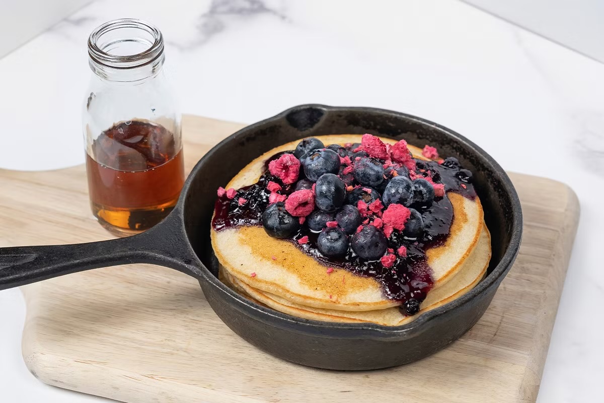 "Pancakes with blueberry compote, fresh blueberries, freeze dried raspberries & maple syrup G= Contains gluten, D= Contains dairy, E= Contains egg, S= Contains soy "