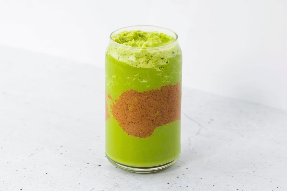 Ceremonial grade matcha green tea powder that naturally detoxifies the body, is rich in antioxidants, and provides a valuable source of fiber and vitamins with almond milk.