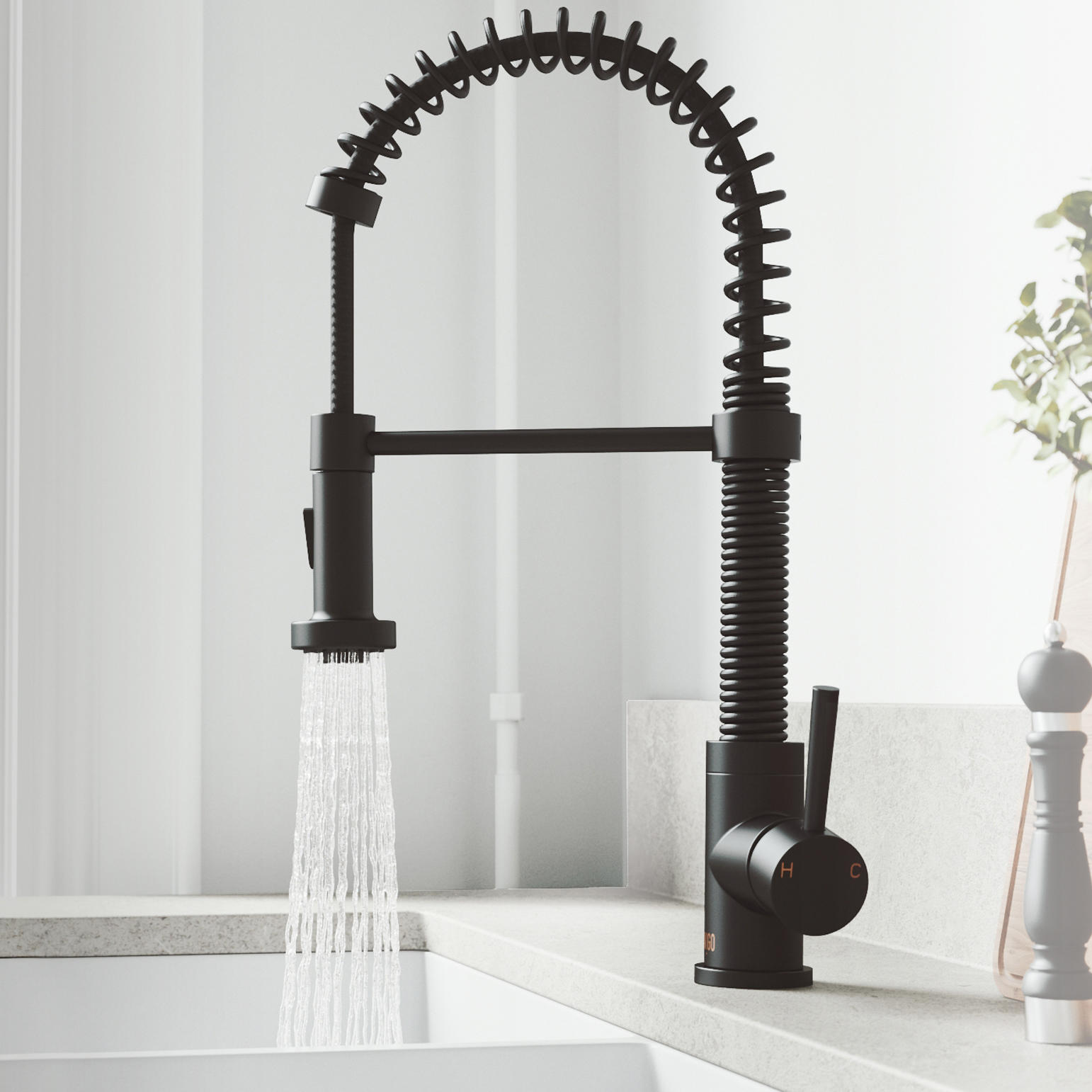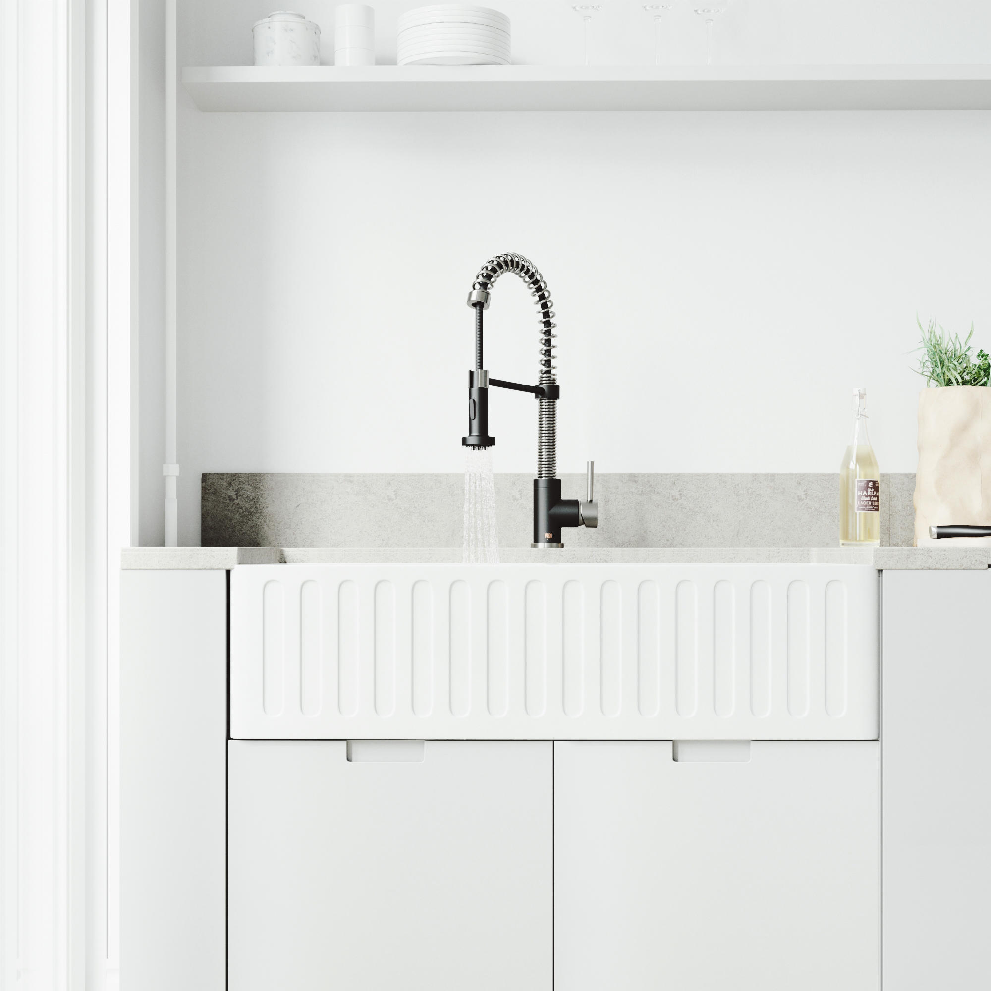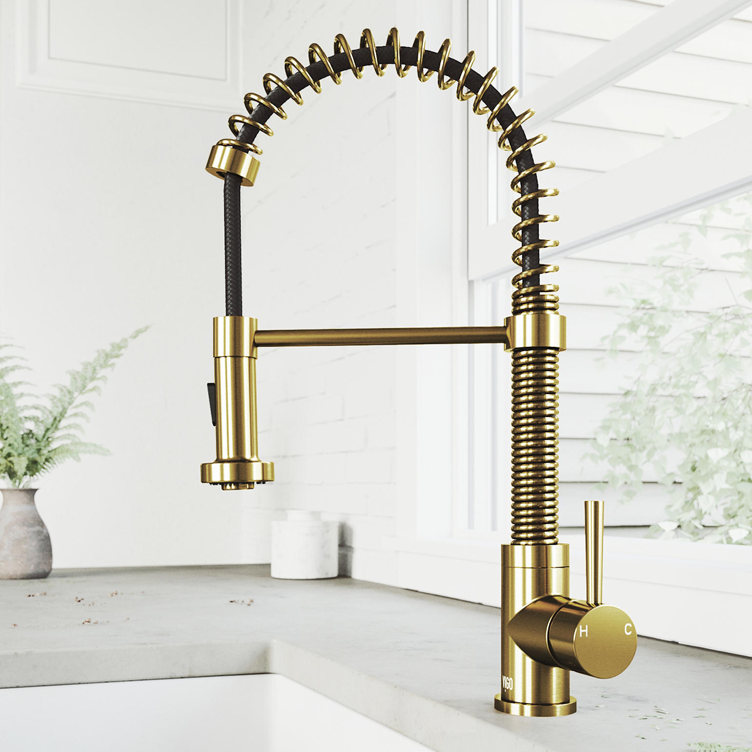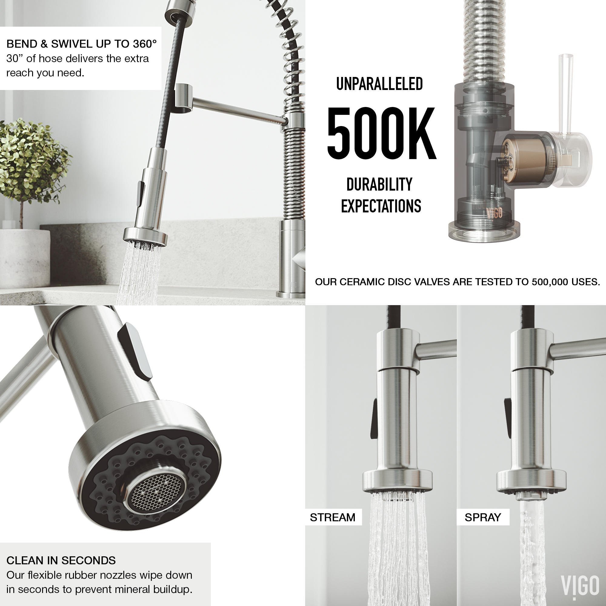 The pull-down, dual action spray head on the VIGO Edison Pull-Down Spray Kitchen Faucet allows for your choice of aerated flow or powerful spray for all your modern kitchen needs. The 360° swivel spout extends up to 30", and its spiral details and solid brass construction make it a highly functional and beautiful statement piece.
