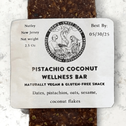 Ingredients: Dates, pistachios, oats, sesame, and unsweetened coconut flakes. Free of added sugar, preservatives, and additives. Crafted for Vegan, Vegetarian, Gluten-Free, low-glycemic, and Kosher pallets, and anyone who enjoys good food