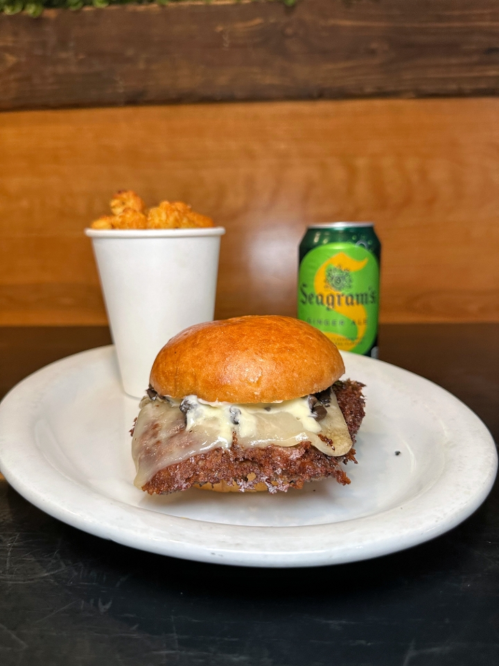 Single Smashed Beef Patty, Umami Truffle Spice, Swiss Cheese, Sauteed Mushrooms, Truffle Herb Aioli, Brioche Bun with choice of side & drink