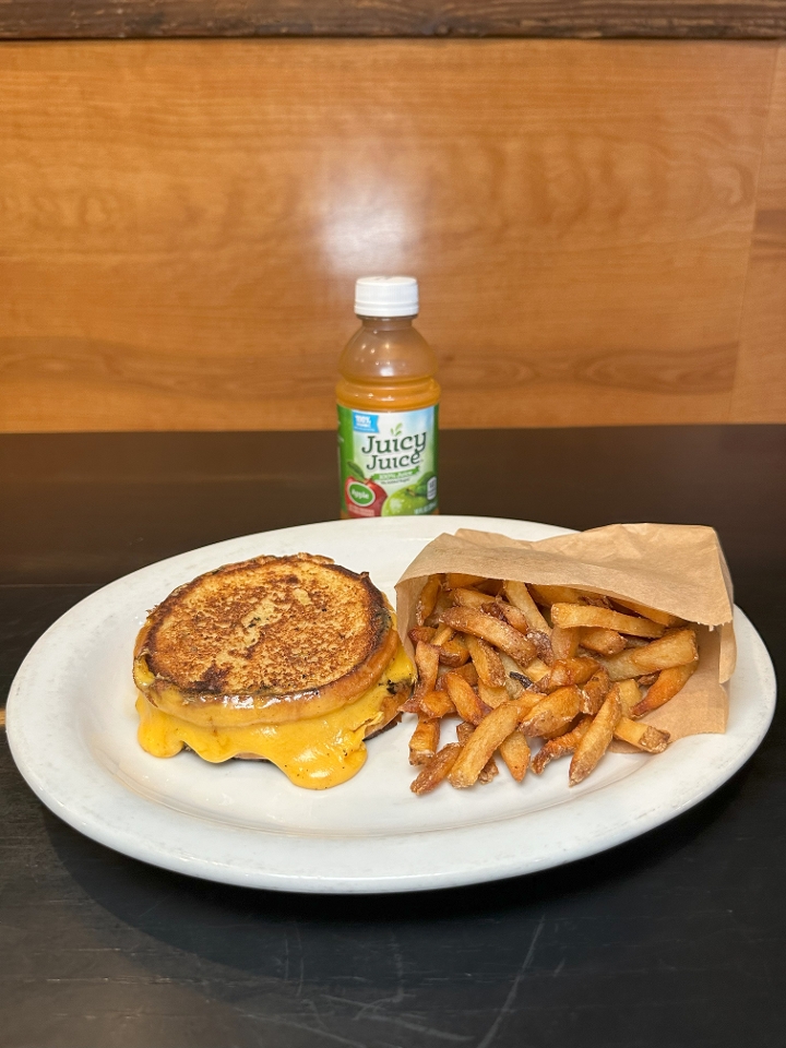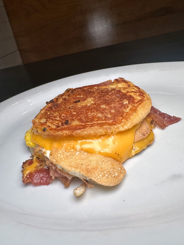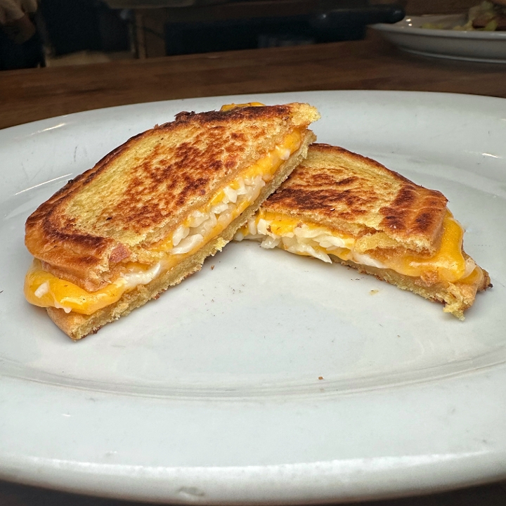 Our Signature Smashed Grilled Cheese made with Sharp American Cheddar and Monterey Jack cheeses, a fried egg, and bacon on a smashed buttery toasted bun.