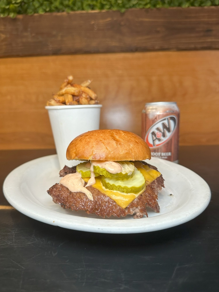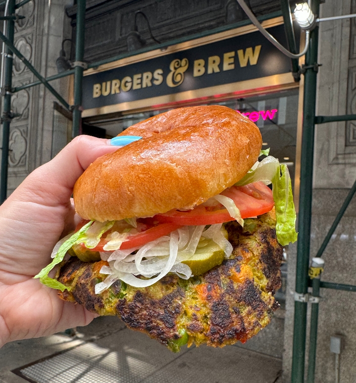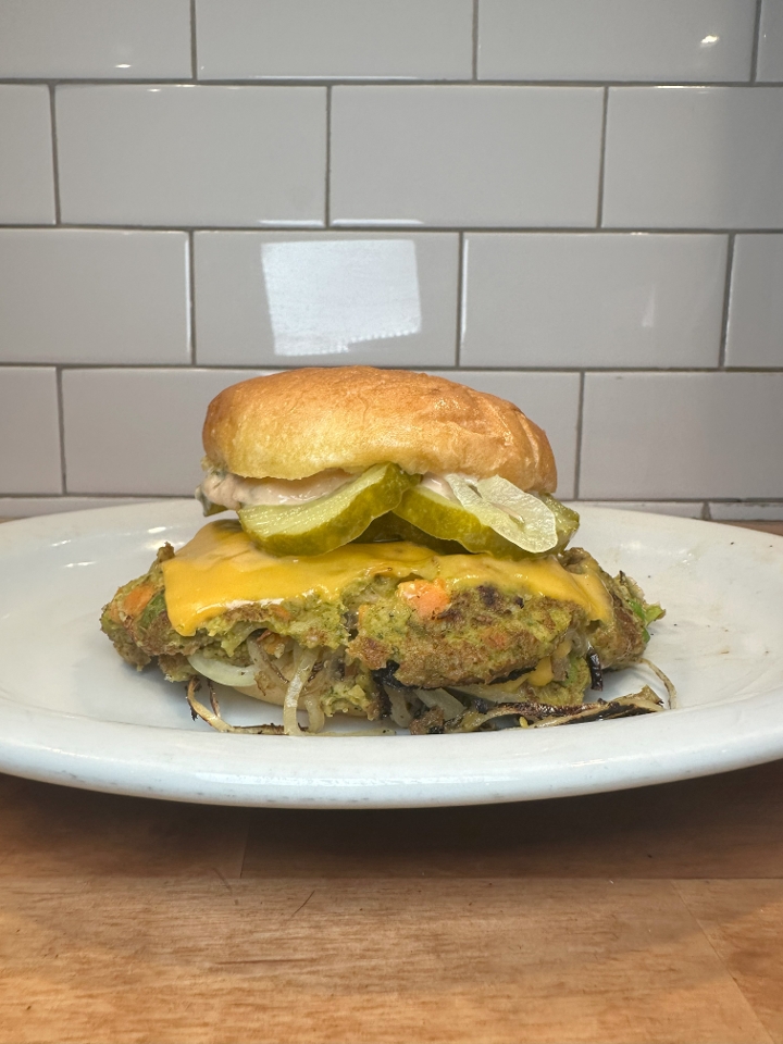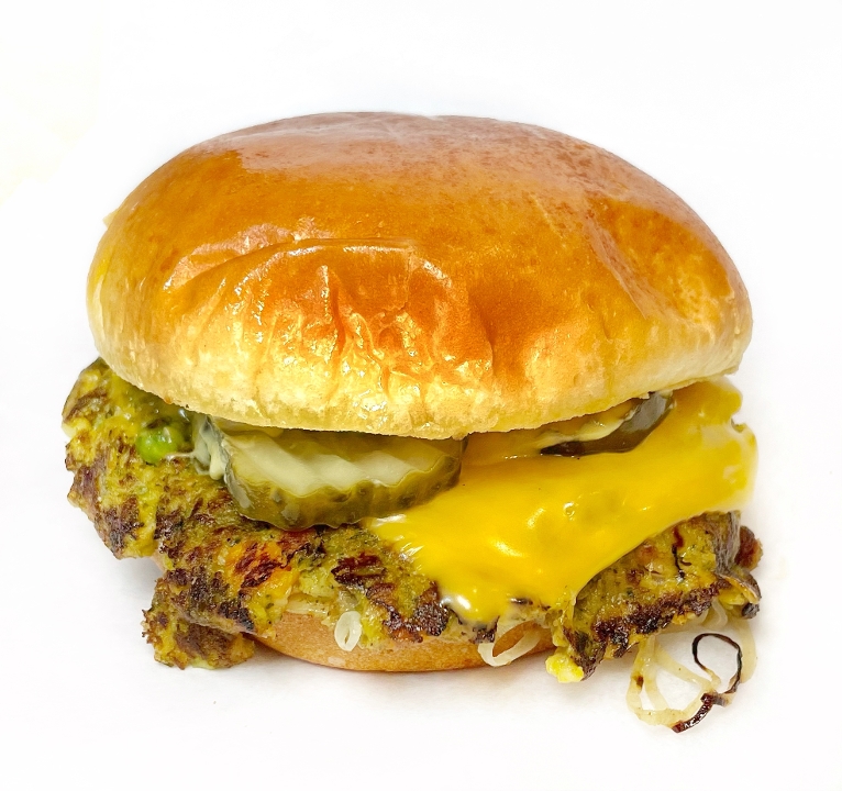 Single All Natural Garden Vegetable Patty Smashed With Shaved Onions, Sharp American Cheddar Cheese, Mayo, Mustard, Pickles, Brioche Bun
