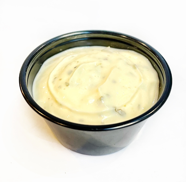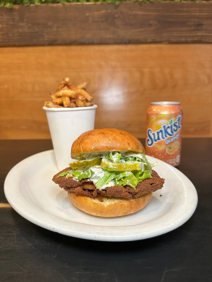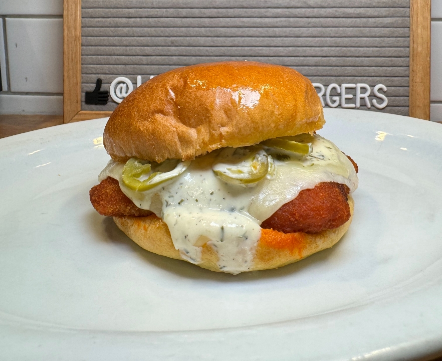 A piece of Fried Chicken, tossed in buffalo spice and hot sauce with Monterey jack cheese, jalapenos, and ranch on a toasted brioche bun.