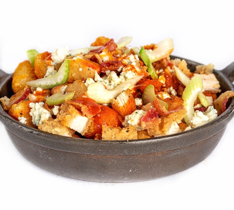 Tots topped with Fried Chicken, Hot Sauce, Buffalo Spice, Bacon, Blue Cheese, Celery * Can be Substituted for fries **CONTAINS:PORK**
