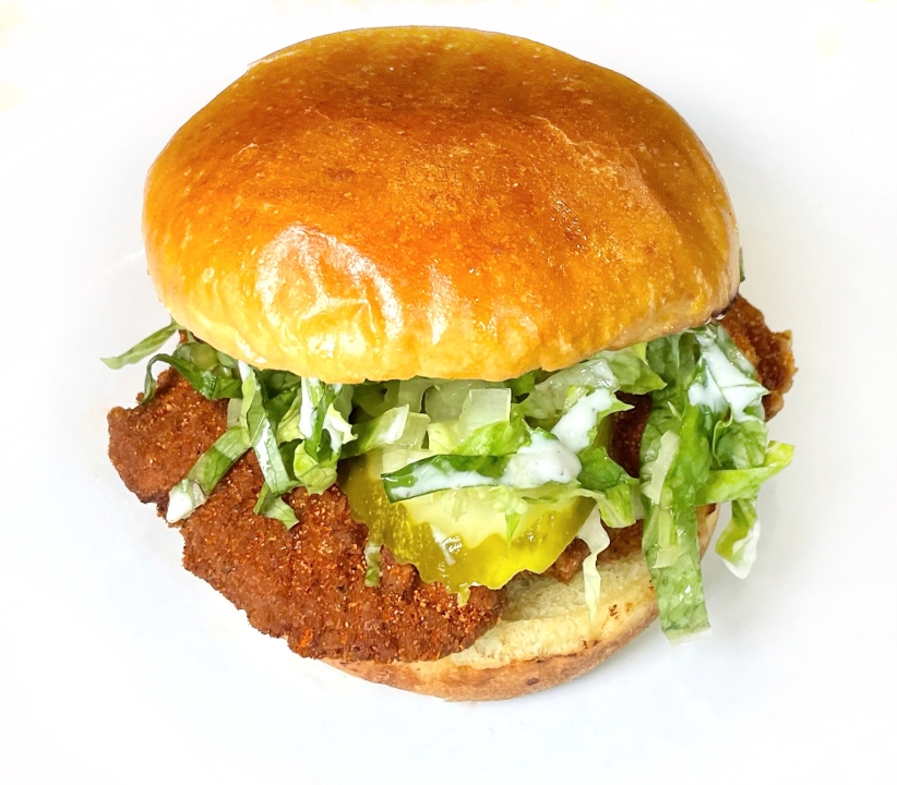Crispy Chicken, Hot Spice, Shredded Romaine Lettuce, Pickles, Ranch on toasted brioche bun with choice of side & drink