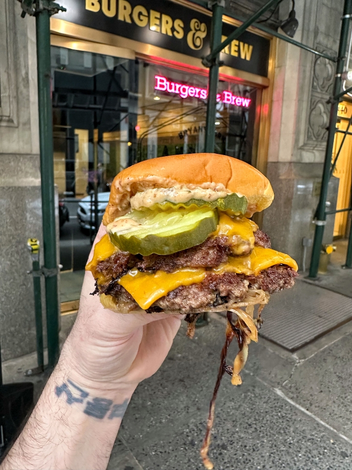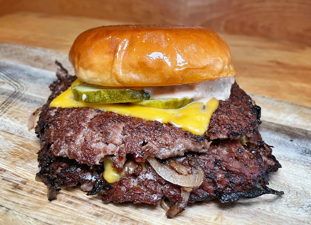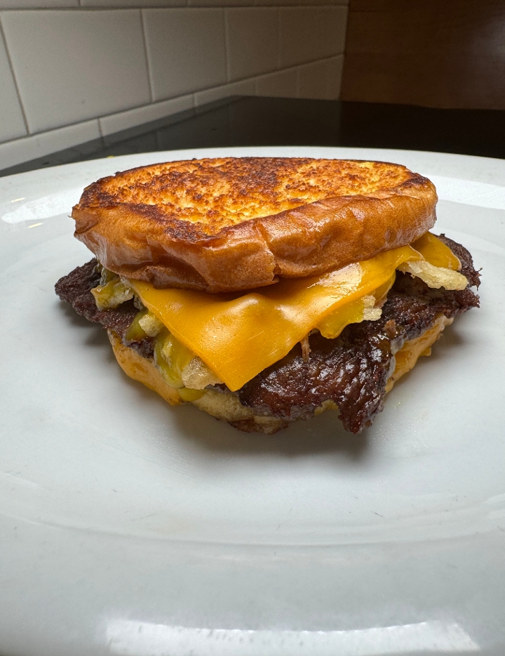 Two 3 oz Smashed Beef Patties with Shaved Onions, Sharp American Cheddar Cheese, Handcraft Sauce, Pickles on a Potato Roll