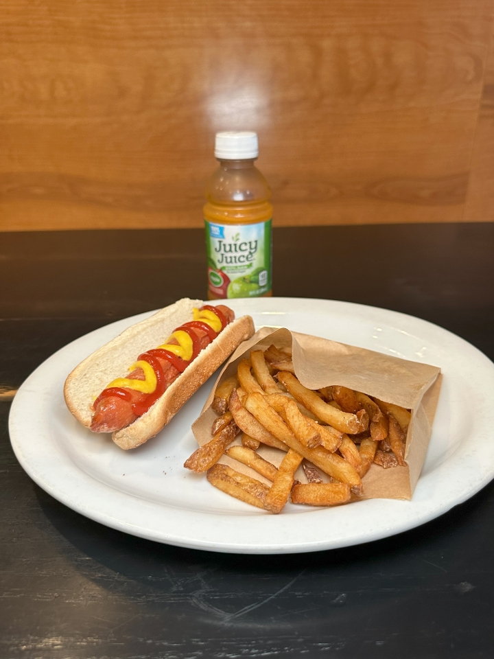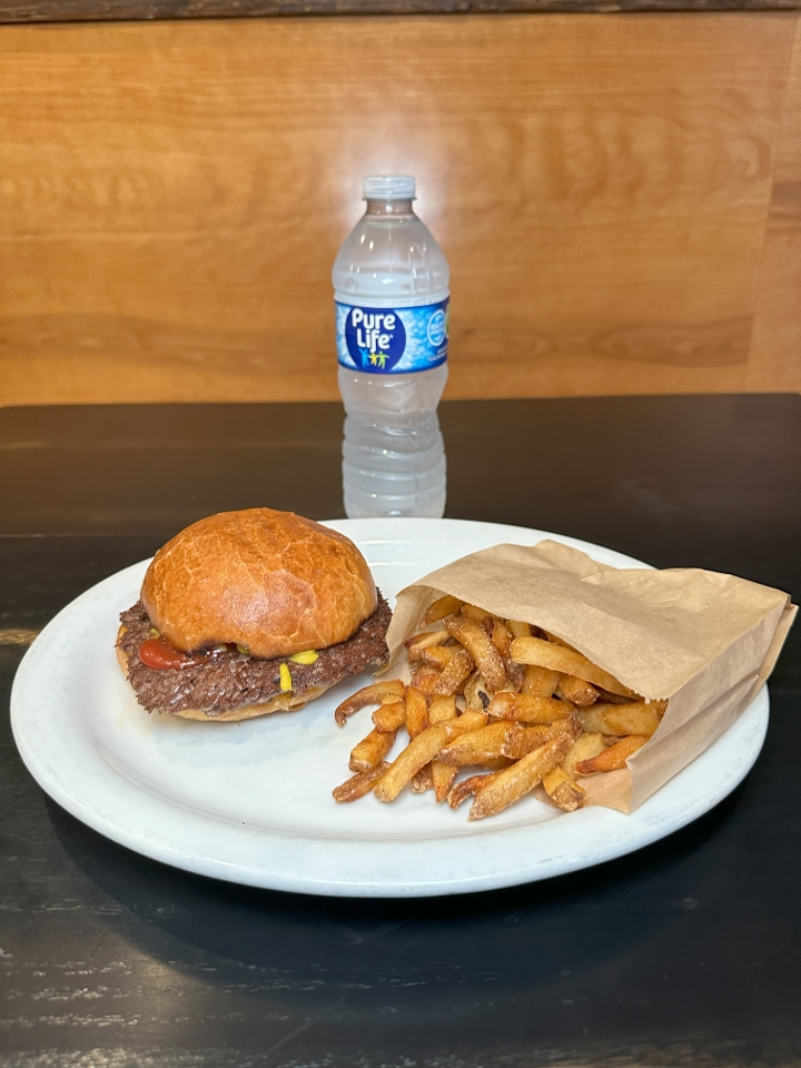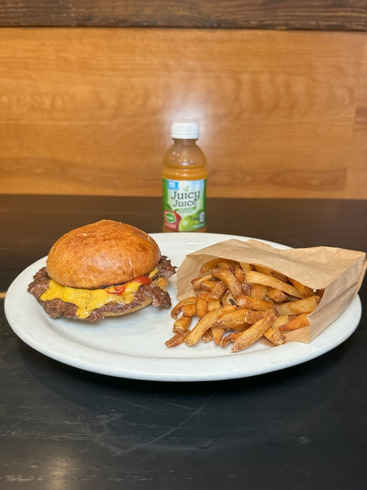 A Single Smashed Beef Patty, a Slice of Melted American Cheddar Cheese with Ketchup, and Yellow Mustard on a toasted Brioche Bun. *Sorry No Add-ons or Substitutions. Must be age 12 and Under.
