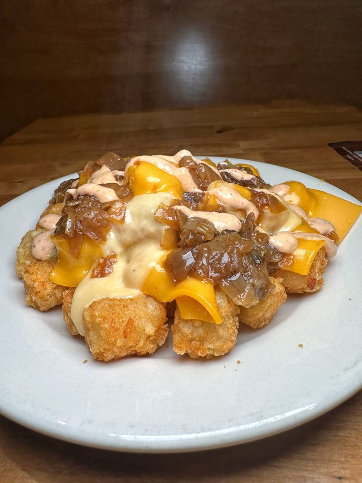 Our Version of Animal style tots, topped with Melted American Cheddar, Beer Cheese, Caramelized Onions, and Our signature Handcraft Sauce.