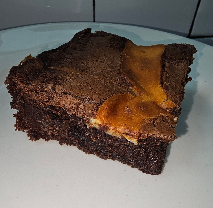 A Rich Chocolate Fudge Brownie with a creamy cheesecake swirl .
