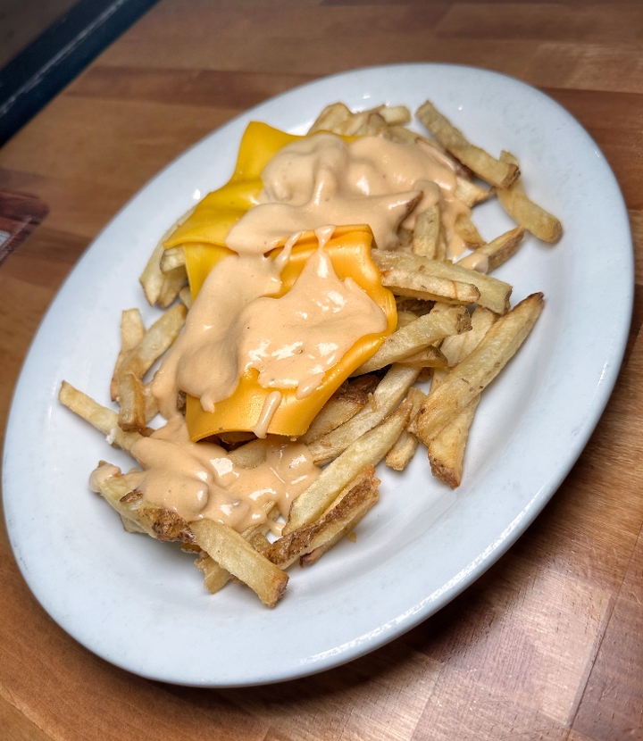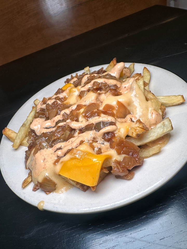 Our Version of Animal style fries, topped with Melted American Cheddar, Beer Cheese, Caramelized Onions, and Our signature Handcraft Sauce.