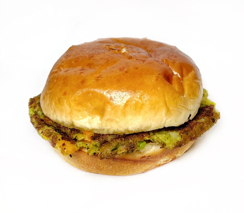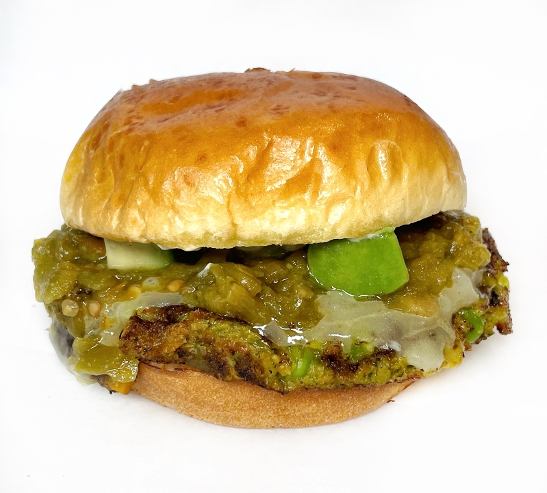 Single Smashed All Natural Garden Vegetable Patty, House Spice Blend, Monterey Jack Cheese, Roasted Hatch Chiles, Avocado, Lime Aioli, Brioche Bun