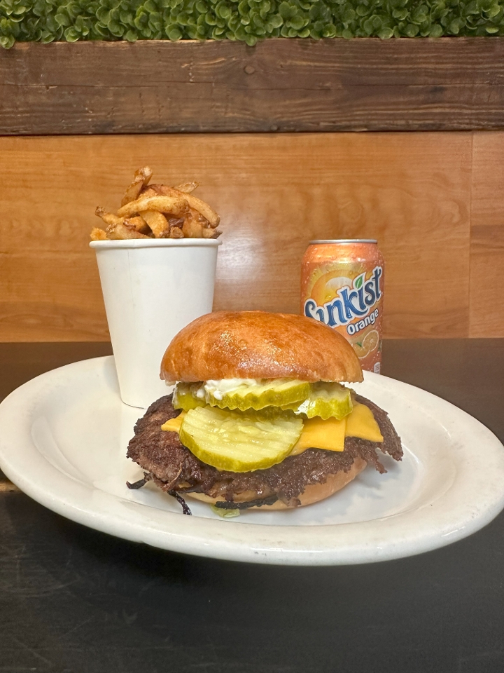 Two Oklahoma Style Smashed Beef Patties Smashed with Shaved Onions, Sharp American Cheddar, Handcraft Sauce, Extra Pickles, Griddled Brioche Bun with choice of side & drink