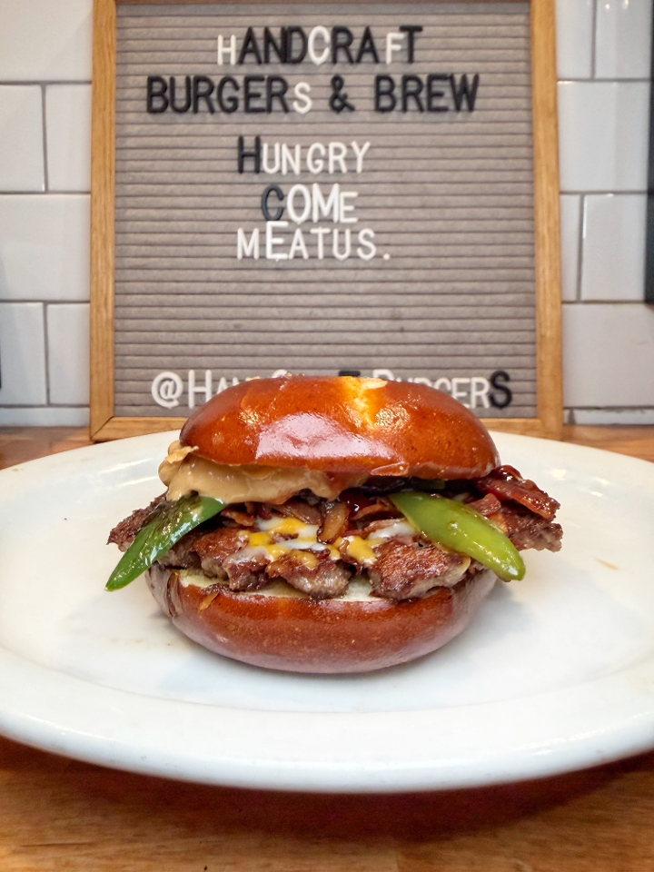 One 3 oz Smashed Beef Patty with Shaved Onions, Sharp American Cheddar Cheese, Bacon, Sriracha Aioli, Jalapenos and a scoop of Crunchy Peanut Butter on a Potato Roll