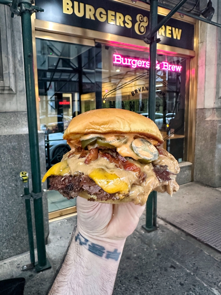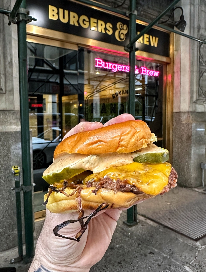 Keywords hamburger, french fries, tater tots, craft beer, Bryant Park restaurant.