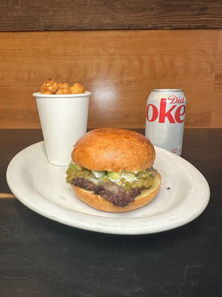 Single Smashed Beef Patty, House Spice Blend, Monterey Jack Cheese, Roasted Hatch Chile, Avocado, Lime Aioli, Brioche Bun with choice of side & drink