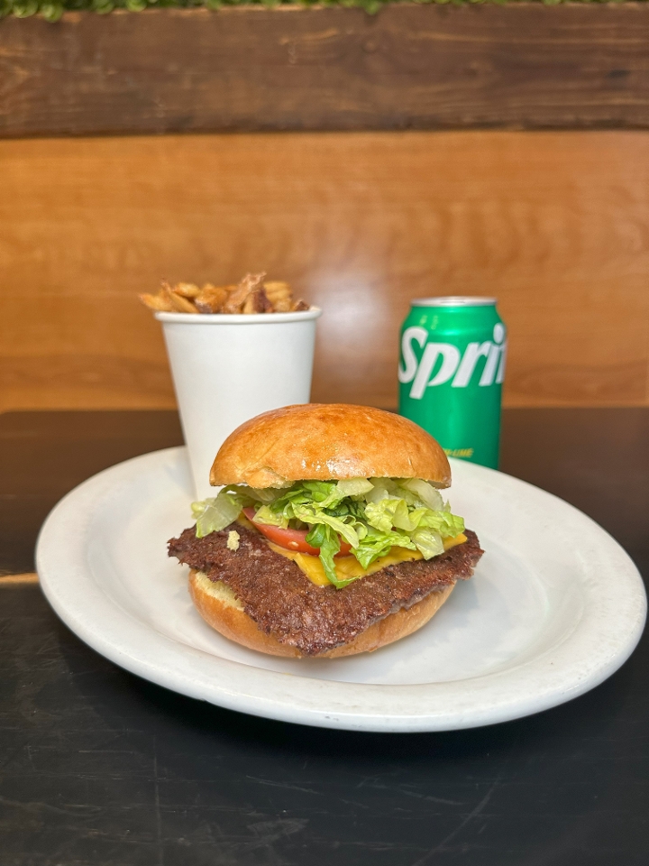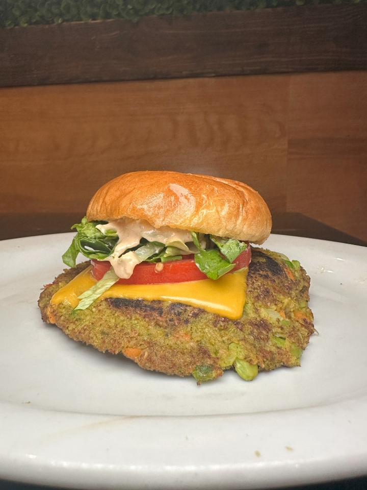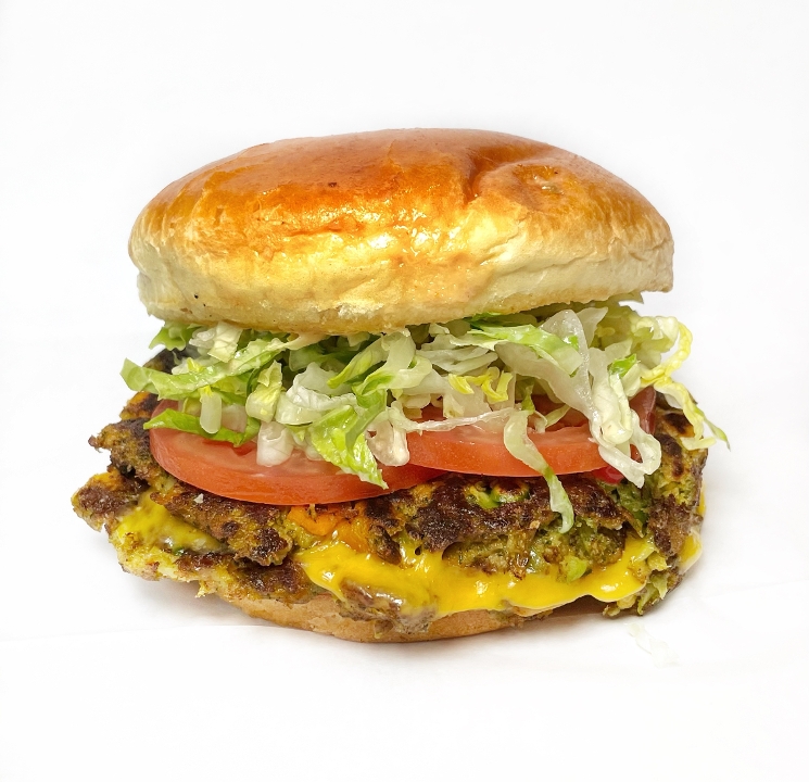 Double Smashed All Natural Garden Vegetable Patties, Sharp American Cheddar Cheese, Handcraft Sauce, Shredded Romaine Lettuce, Tomato, Brioche Bun