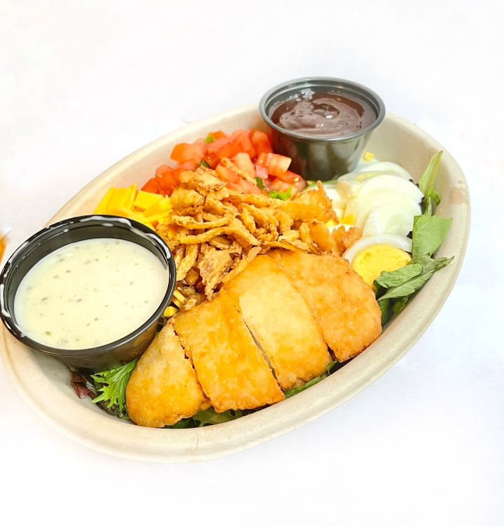 Shredded Romaine lettuce, Fried Chicken, Cheddar, Tomato, Fried Onion, BBQ Sauce, Ranch