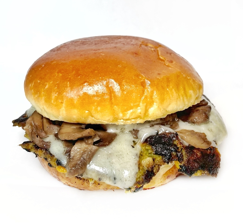 Single Samashed All Natural Garden Vegetable Patty, Umami Truffle Spice, Swiss Cheese, Sauteed Mushrooms, Truffle Herb Aioli, Brioche Bun