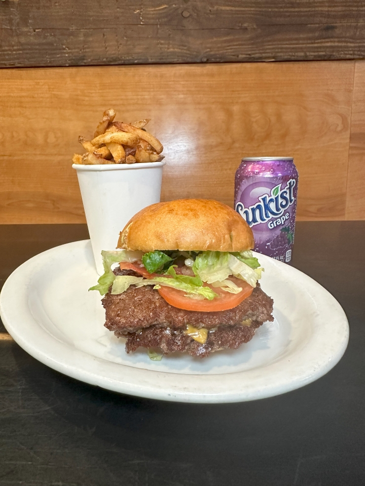 Double Smashed Beef Patties, Sharp American Cheddar, Handcraft Sauce, Shredded Romaine Lettuce, Tomato, Brioche Bun with choice of side & drink.