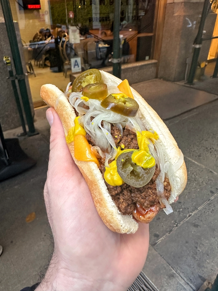 A Ripper with Melted American Cheddar, Rochester Hot Meat Sauce, Pickled Jalapenos, Shaved Raw Onions, and yellow mustard on a toasted brioche hot dog bun.