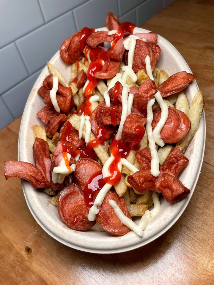 Our Version of Salchipapa : Our Signature fresh Hand cut Handcraft fries with slices of Fried Ripper Pieces served with ketchup and mayo drizzled on top.