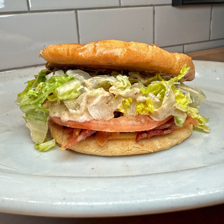 A Buttery Smashed inverted bun with our Signature Handcraft Sauce, Bacon, Lettuce, and Tomato. **CONTAINS: PORK**